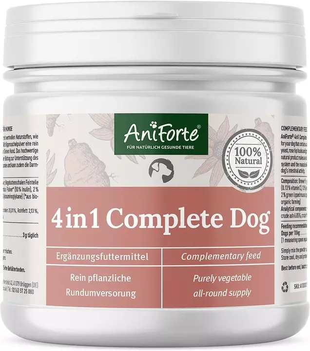 - Brewer’s yeast powder, rose hip husks fine parts (0.13% vitamin C), 10% jerusalem artichoke powder* (50% inulin), 2% green lipped mussel powder (3.3% glycosaminoglycans).