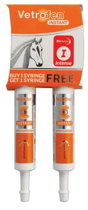 Vetrofen Intense INSTANT is a concentrated apple flavoured formulation served in an easy-use syringe for oral administration, containing a completely natural antioxidant blend that supports the comfort and recovery of equines. Vetrofen Intense INSTANT has been scientifically formulated to help horses and ponies when they require support in dealing with intense activity or recovery. Vetrofen Intense INSTANT is free from banned ingredients and is safe to use with the performance horse.