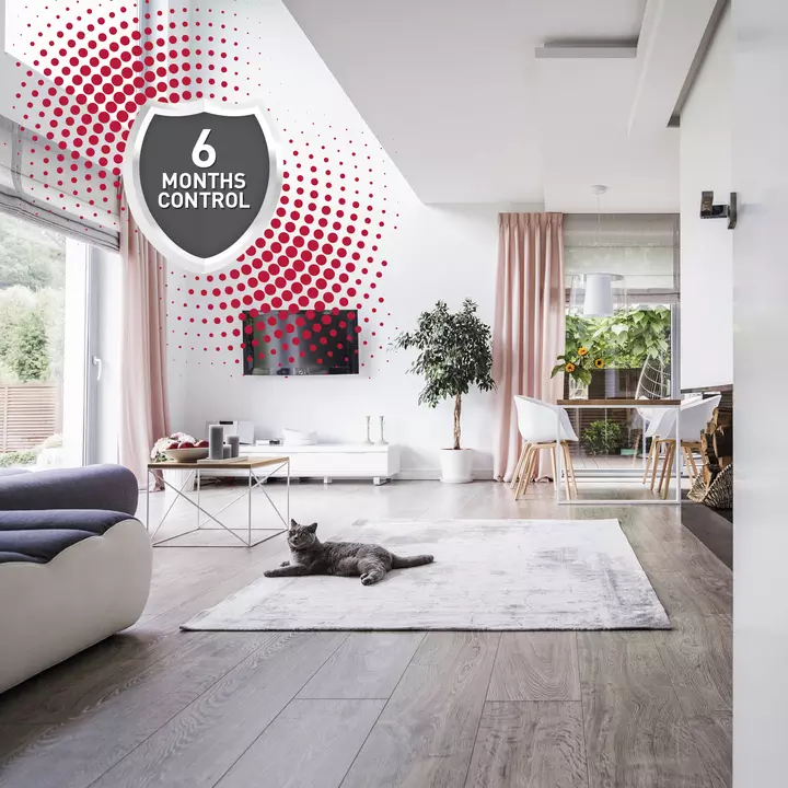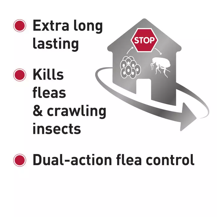 A premium flea control product, combining fast-acting insecticides to kill adult fleas and an insect growth regulator, which prevents the development of larvae and eggs, breaking the flea lifecycle. Effective in the environment for up to six months.