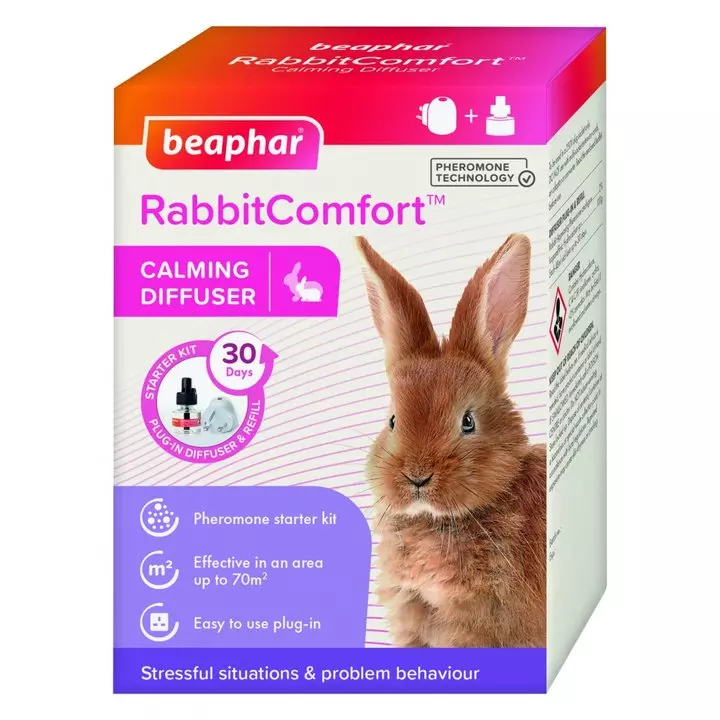 Beaphar RabbitComfort® Calming Diffuser: a complete starter kit containing a diffuser plug-in and one refill, perfect for calming indoor rabbits. Ideal for helping rabbits settle into a new home, for creating a calming atmosphere when bonding with another rabbit, and for reducing general anxiety caused by loud noises in the home.