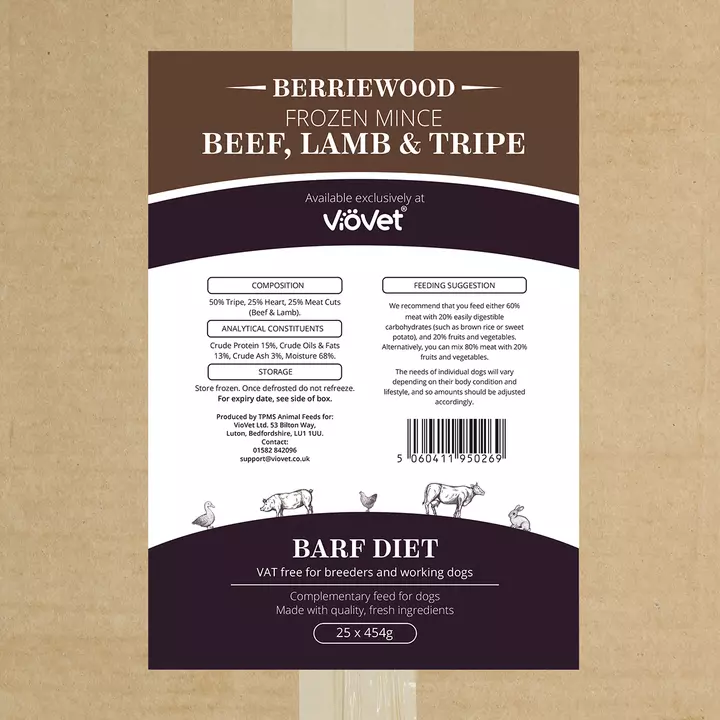 | Meat/Tripe | 50% Tripe, 25% Hearts, 25% Lamb & Beef Meat Cuts. | Protein 15%, Oil & Fats 13%, Moisture 68%, Ash 3%. |