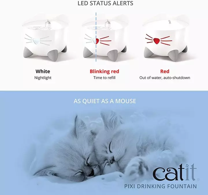 The nose on this Catit PIXI fountain provides some fantastic features like turning red when the water level is too low, and the LED nightlight guides cats to the fountain even in darkness.