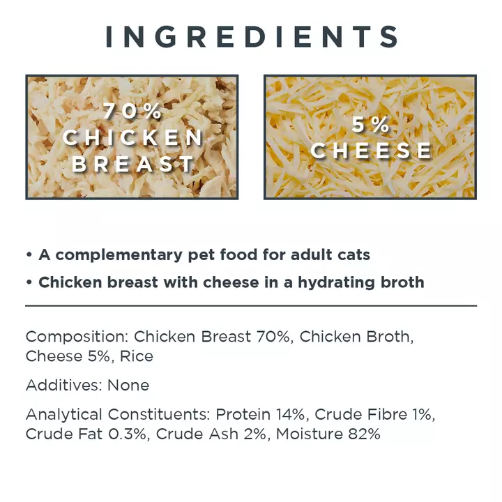 - Chicken Breast (70%), Chicken Broth, Cheese 5%, Rice
