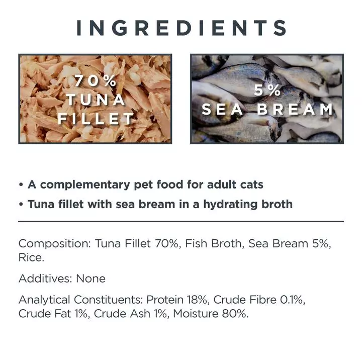 - Tuna Fillet 70%, Fish Broth, Sea Bream 5%, Rice