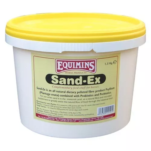 Equimins Sand-Ex is an all natural dietary pelleted fibre product Psyllium (Plantago ovata) combined with Probiotics and Prebiotics. For use when sand is in the intestinal canal, as a natural fibre and microbial supplement to greatly assist the natural flow of food through the intestinal tract.