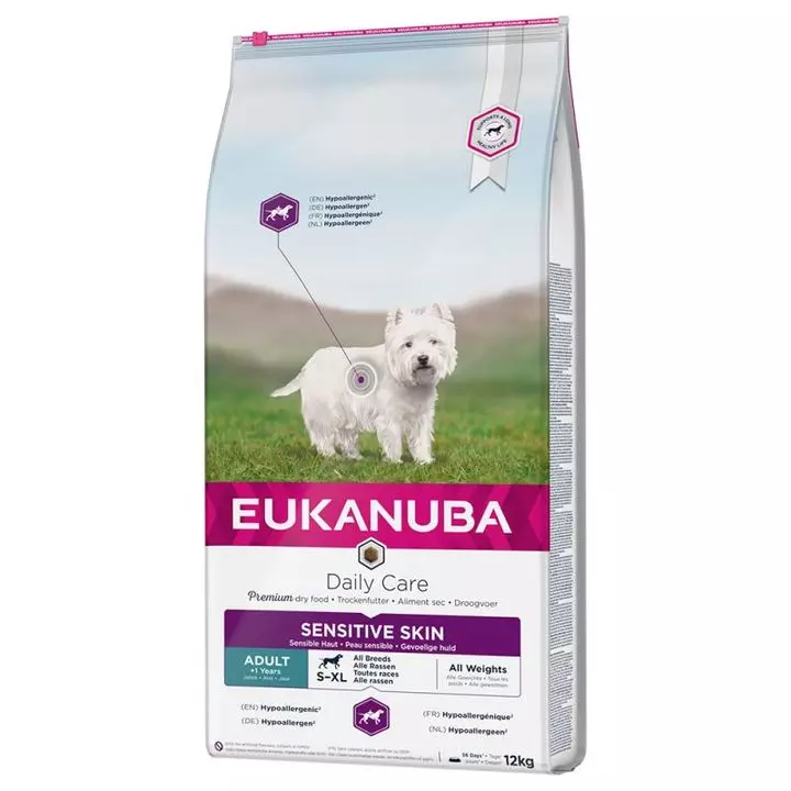 Daily Care Sensitive Skin from Eukanuba is an adult dog food that limits ingredients which could cause itching and scratching in dogs. This special formulation contains vitamin rich fish as its primary protein source and is especially for adult dogs with a tendency to sensitivities such as a dull coat and dry skin.