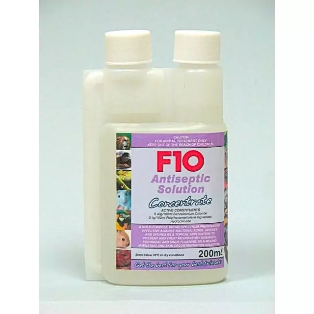 Using clean or distilled water prepare a solution of 1:250 of F10 Antiseptic Solution. Administer topically using a nebuliser or fogger for 20 to 30 minutes twice daily or as directed by the veterinarian.