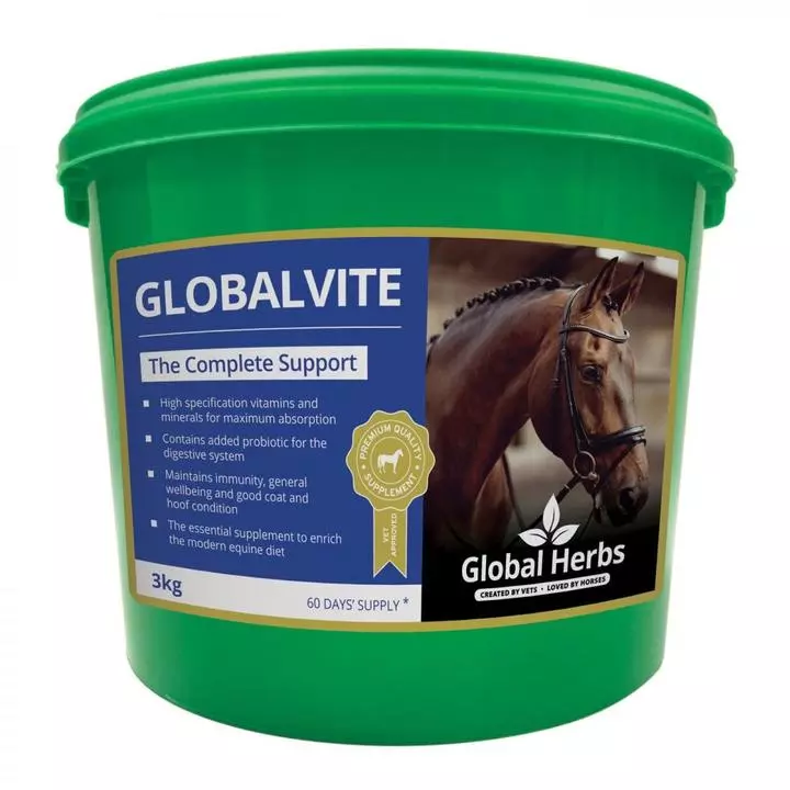 Feed 3 x 25ml level scoops daily for an average 500kg horse. Reduce to half this amount for maintenance levels. GlobalVite can be fed throughout the year.