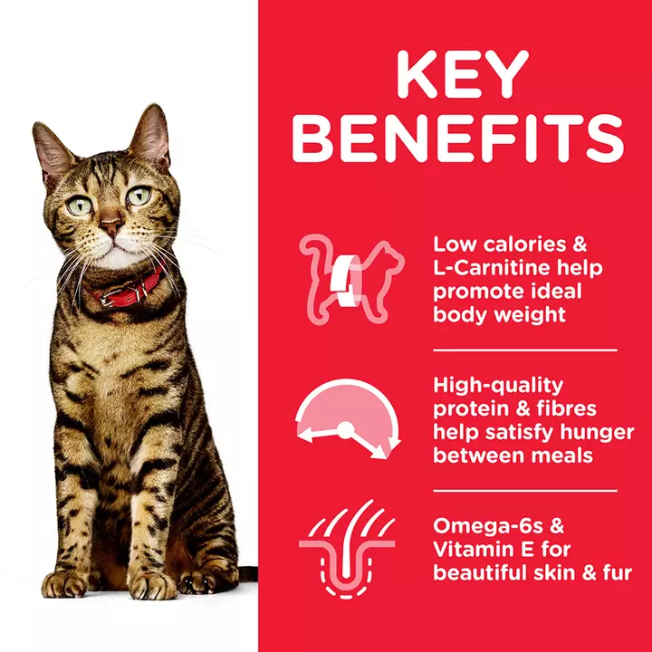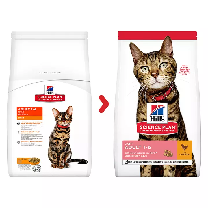 HILL’S SCIENCE PLAN Light Adult dry cat food is precise nutrition for less active adult cats requiring a low calorie food to maintain a healthy weight & lifestyle.Low calories & L-Carnitine help promote ideal body weightHigh-quality protein & natural fibers help satisfy hunger between meals and Omega-6s & Vitamin E for beautiful skin & fur.