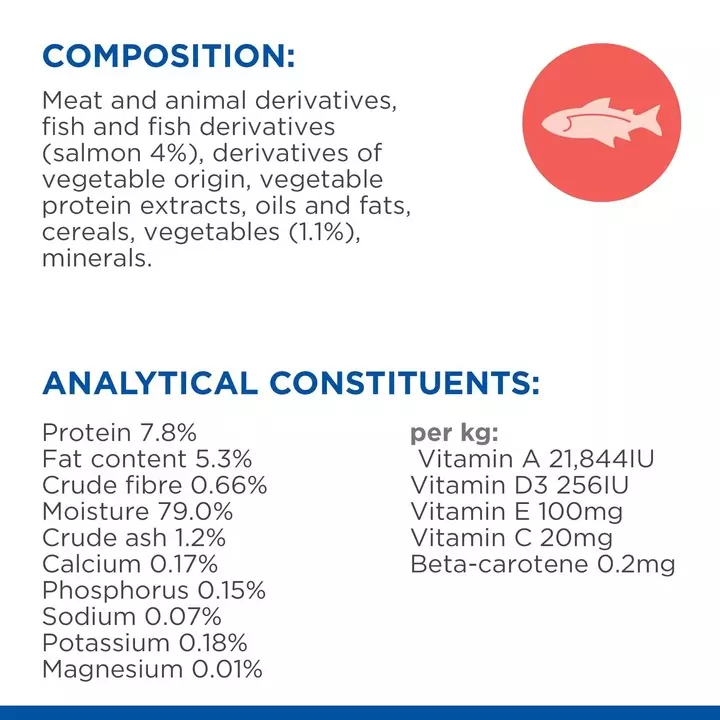 - Stew with Salmon & Added Vegetables: Pork liver, Chicken, salmon (4%), wheat gluten, rice starch, animal fat, rice flour, digest, rice, dried carrots, cellulose, minerals, soybean oil, fish oil, spinach powder, vitamins, taurine and trace elements. Total vegetables (1.1%).
