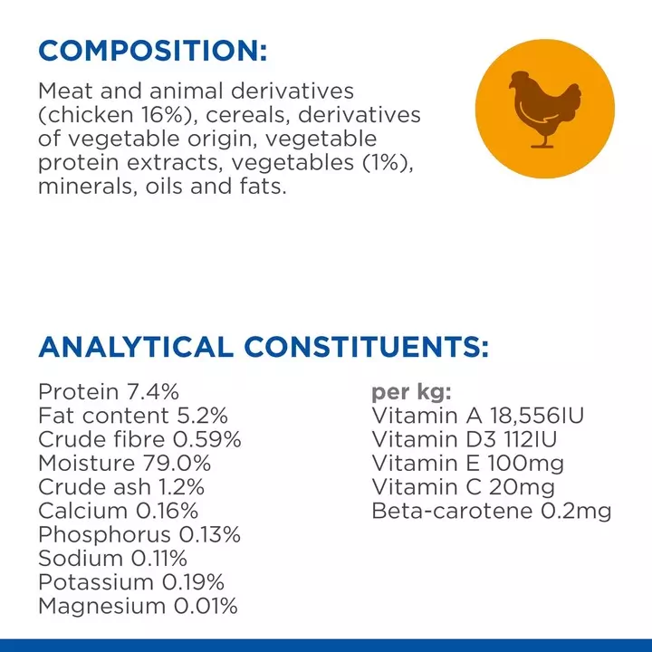- Stew with Chicken and Added Vegetables: Chicken (16%), pork liver, rice flour, rice starch, wheat gluten, digest, dried carrot, minerals, cellulose, rice, animal fat, dried spinach, soybean oil, vitamins, taurine and trace elements. Total vegetables (1%).
