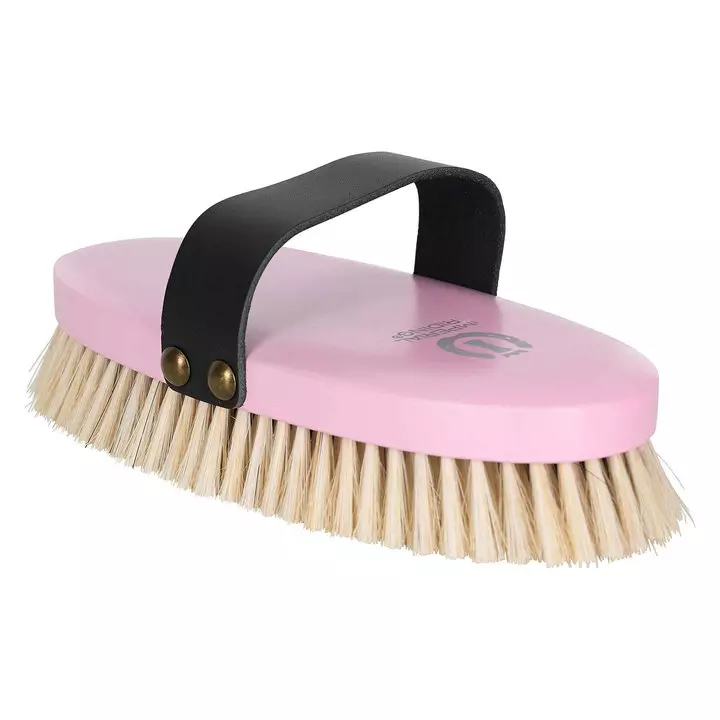 - Soft brush with horse hair, a wooden back and a leather strap.