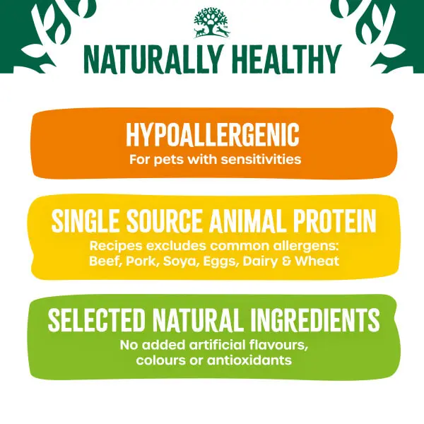 HYPOALLERGENIC DOG FOOD FOR PETS WITH SENSITIVITIES Selected Natural Ingredients* No added artificial flavours, colours or antioxidants