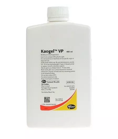 Kaogel VP Suspension from Pfizer is a specially formulated treatment in liquid form for feline and canine diarrhoea. Using the powerful ingredient Kaolin, Kaogel helps to protect and secure the lining of the intestine and absorbs toxins from within the intestine. Kaolin is also known to increase faecal bulk, thus promoting firmer stools.