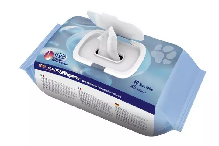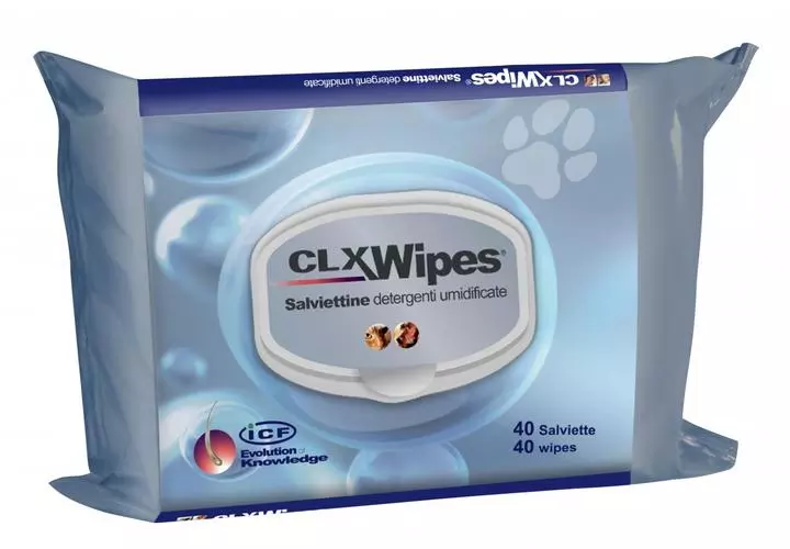 CLX Wipes are practical disinfecting wet wipes for dogs, cats, horses and other animals for daily cleansing of paws, interdigital spaces and skinfolds (nose, lip and vulva).