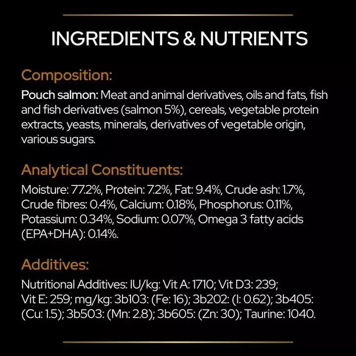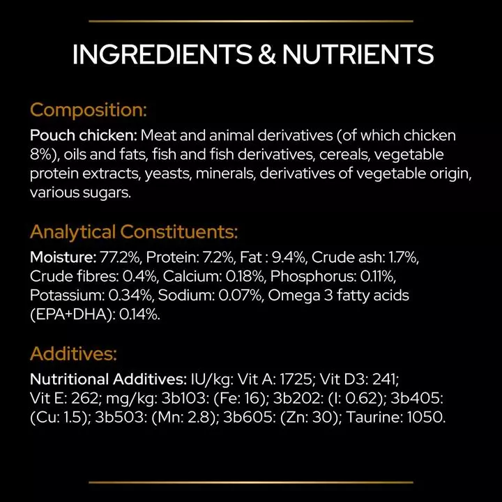 Meat and Animal Derivatives (of which Chicken 4%). Oils and Fats. Fish and Fish Derivatives. Cereals. Vegetable Protein Extracts. Yeasts. Minerals. Derivatives of Vegetable Origin. Various Sugars. Protein Sources: Pork (Liver, Kidney, Trachea, Plasma Powder). Gluten. Chicken. Yeast and Salmon