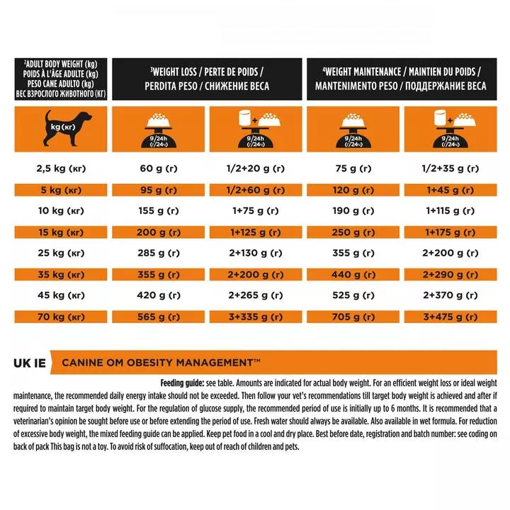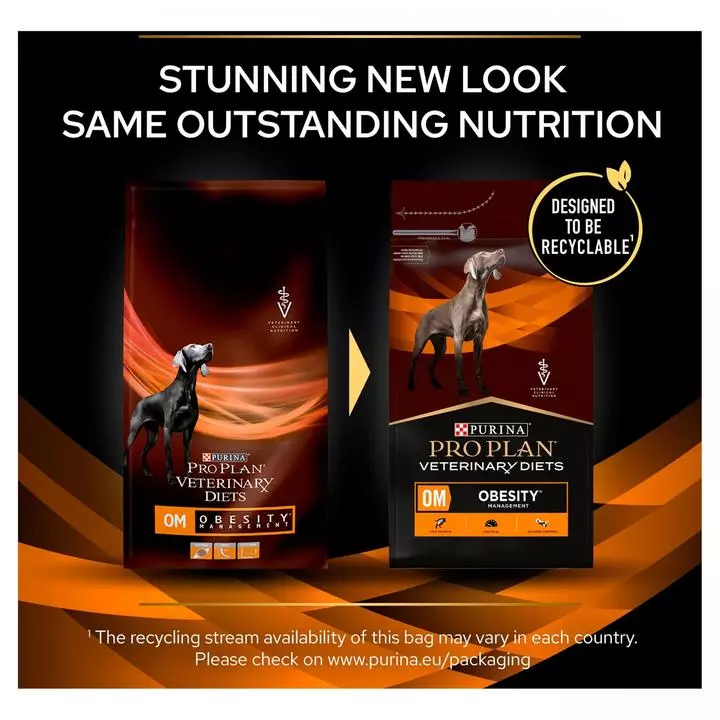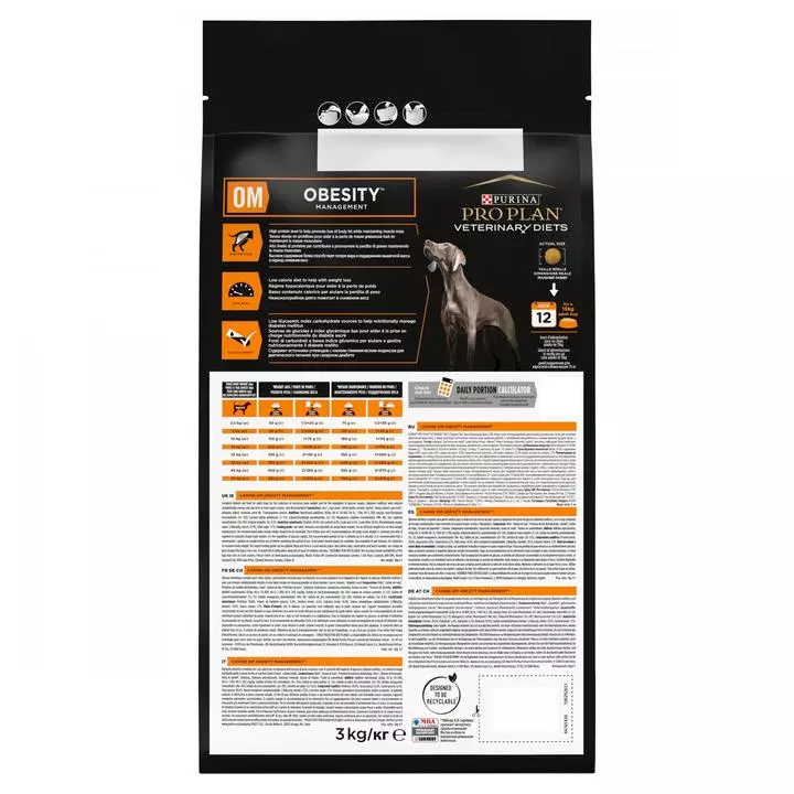 PURINA® PROPLAN® VETERINARY DIETS Canine OM Obesity Management is a complete veterinary diet clinically proven to be effective for weight loss in obese dogs. Dogs kept fit and trim can live up to two years longer than overweight dogs*, which is why PPVD OM is low in fat and calories whilst being high in protein to encourage steady and effective weight loss while maintaining muscle mass. Made with high levels of natural fibre and protein to help your dog feel full and satisfied, it is also highly palatable to help make losing weight easier. Once ideal weight is reached your dog can continue to be fed PPVD OM to help maintain dog’s ideal weight. PPVD OM is also suitable for overweight diabetic dogs as its complex, low GI carbohydrates, natural fibre and high protein levels help to control glucose (sugar) levels in the blood. Note that PPVD OM is not recommended for dogs that need a higher calorie intake such as pregnant bitches or growing puppies. * Purina study.
