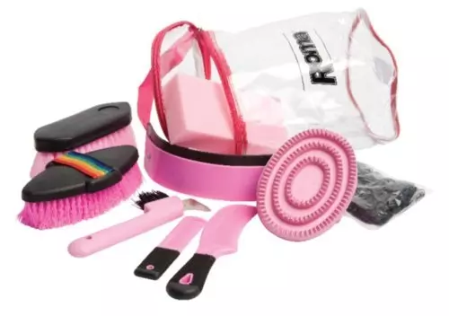 The fabulous Grooming Kit from Roma gives you everything you need to ensure your horse is groomed to perfection. This Grooming Kit is a brilliant product for a new horse owner or someone looking to replace a old kit. The Kit includes Body Brush, Dandy Brush, Sweat scraper, Curry Comb, hoof pick with brush, Mane comb, Mane and Tail comb, rubber bands and a sponge. This Grooming Kit is also available in various fun colours.