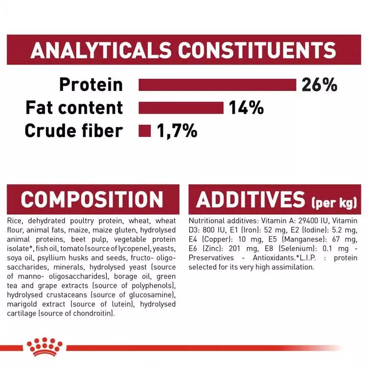 Rice, dehydrated poultry protein, wheat, wheat flour, animal fats, maize, maize gluten, hydrolysed animal proteins, beet pulp, vegetable protein isolate*, fish oil, soya oil, yeasts and parts thereof, tomato (source of lycopene), psyllium husks and seeds, fructo-oligo-saccharides, hydrolysed yeast (source of manno-oligo-saccharides), minerals, borage oil, hydrolysed crustaceans (source of glucosamine), marigold extract (source of lutein), hydrolysed cartilage (source of chondroitin). Crude ash: 4.7%. Crude fibre: 1.7%. Crude oil fats: 14%. Moisture: %. Protein: 26%.