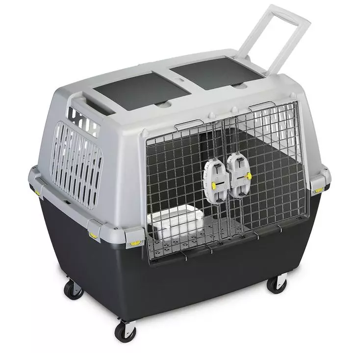 Multifunctional travelling pet carrier. 2 door opening on the long side for easy access. Features robust 3 way locking system. Insert a separation panel (not included) to enable transportation of more than one animal. Wheel castors as shown not included. Size: 80 x 58.5 x 62cm.