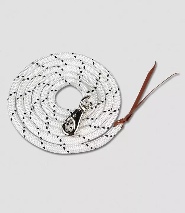 Thick, braided yachting rope, heavy duty bull snap spliced on, leather flipper at end.