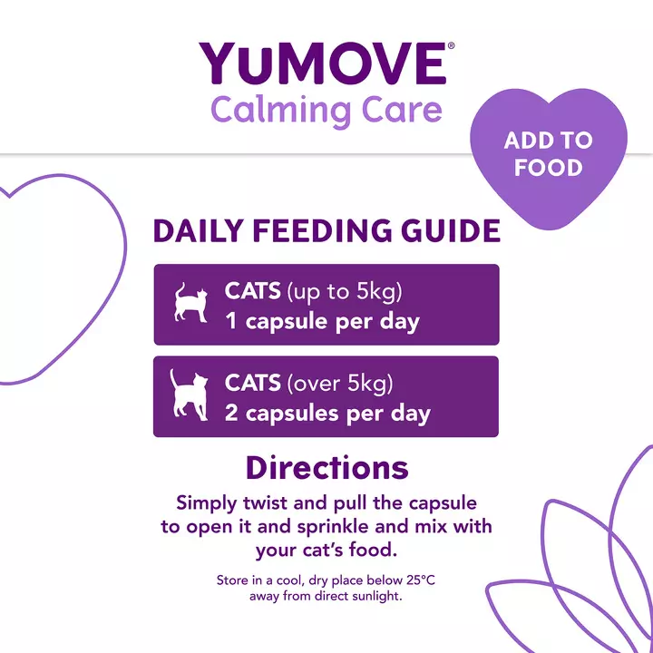 It’s perfect for cats who feel anxious in day-to-day life, or those fearful towards specific triggers like fireworks, other cats, strangers, visits to the vet, new homes or car travel. By supporting the natural pathways in the brain, YuMOVE’s unique targeted formula works best when given daily to help reduce stress and help cats to behave more calmly.